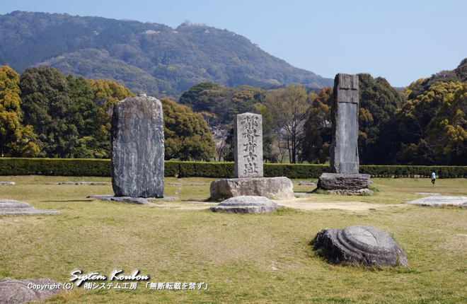 大宰府政庁跡には桜の木が100本ばかりあり、春には花見ができる桜の名所です。大人は花の下で花見を行い、子供は広場を走り回る光景を良く見ます。ここは車も来ないので安全でいいですね。
