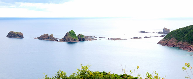 ◆ 名勝「坊津」として国の文化財に指定された双剣石(そうけんせき)と鵜ノ島(うのしま) ![]()
