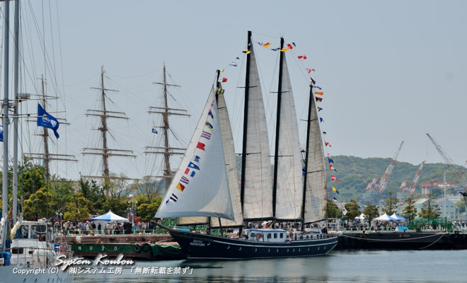 ◆ いくつかの帆船が見える (手前は「ドーントレッダー」という帆船、そして韓国のコリアナ、マストだけ見えるのが日本丸) ![]()