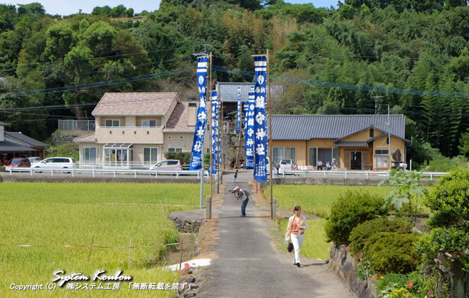 ◆ 【8:48頃】 西塩屋の道行(みちゆき)が始まった ![]() ◆ 西塩屋には鳥毛(とりけ)はいないようだ ![]() ◆ 稲が黄金色に輝き始めた田んぼ沿いの道で道行(みちゆく)は行われる ![]()