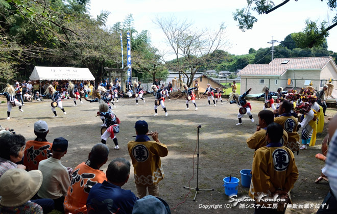 ◆ 【10:32頃】 西葉一声(いっせい)浮立の奉納 ![]() ◆ 子供の演奏。一声浮立は太鼓浮立ともいわれ大小の太鼓を中心に囃す(はやす)浮立です ![]() ◆ 今度は大人が太鼓を叩く ![]()