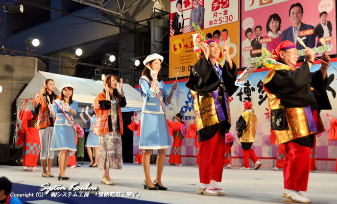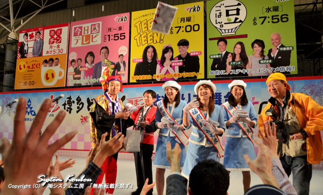 ◆ 18時50分頃からどんたく広場にてフィナーレの誰でも参加できる「総おどり」が行われる (広場本部地区) ![]() ◆ お祭り本舞台では福岡親善大使の皆さんや市長、祭り役員などが一緒に踊ります ![]() ◆ 福岡親善大使の3名 ![]() ◆ 最後の締めは、祝いめでた・手一本 ![]() ◆ どんたく特製タオルを撒く(まく) ![]() ◆ 花自動車6台が市内各所をまわる(赤レンガ会館前にて) ![]()