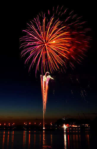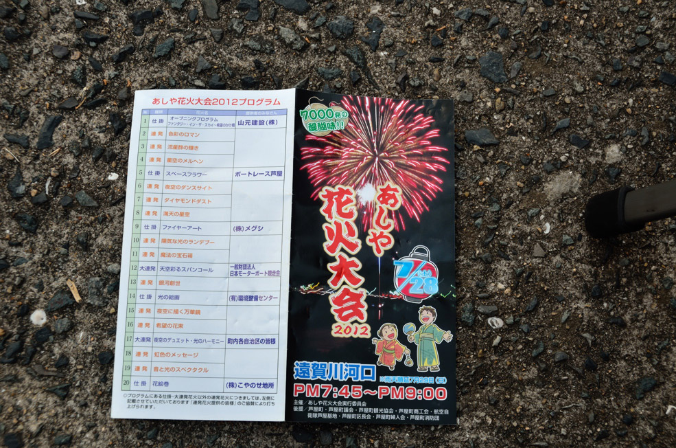 花火は河口に浮かんだ2隻の台船の上から打ち上げられます。川岸からの距離感も丁度良い感じで光と音が、大きくずれることなく聞こえます。