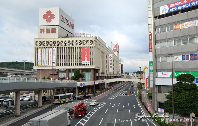 ◆ JR黒崎駅からペデストリアンデッキでつながるコムシティ(COM CITY)。公共施設と商業施設が入居する官民複合施設 ![]() ◆ ペデストリアンデッキ(歩行者回廊)から見るデパート井筒屋 (この道路は国道3号線) ![]()