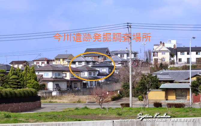 ◆ 木が茂っている向こうが今川遺跡のあった丘の続き(今は住宅街) ※木の下に今川が流れている