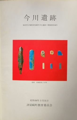 ◆ 今川遺跡の出土品 (調査報告書 本扉の写真) ※ 左から有茎両翼銅鏃(やじり)、銅鑿(どうのみ)、玉類