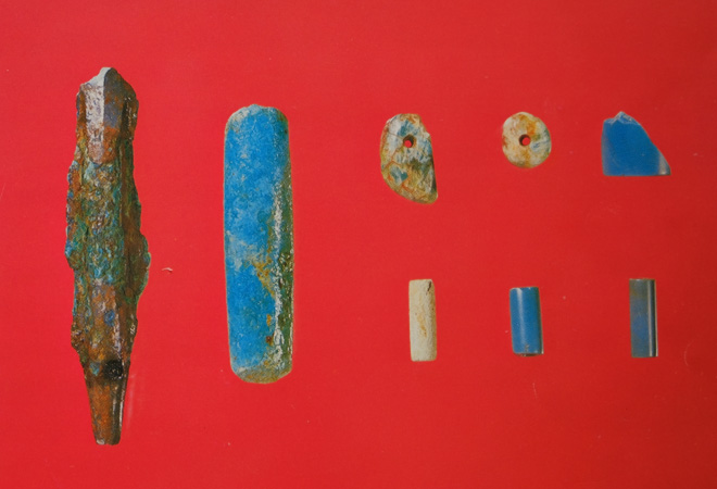 ◆ 上の2つは銅鑿(どうのみ)、銅鏃(どうぞく)、下は 勾玉(まがたま)、丸玉(まるたま)、管玉(くだたま)