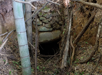 ◆ 古墳の周辺は竹林になっている ![]() ◆ 古墳の入口の左側にある石塔の残骸らしき物 ![]() ◆ 丸い石があるので五輪の石塔だと思われる ![]() ◆ 古墳の北東にある大森池(下)の溜池。これを造るために9軒の農家が強制移転し、この古墳のそばに来たようだ ![]()