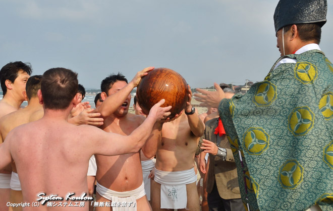 ![]() ◆ 【11:16頃】 玉を担ぎ福間海岸に向かう ![]() ◆ 古い町並みが残る福間浦の町中を通り福間海岸に向う ![]() ◆ 【11:32頃】 福間海岸に到着 (担いでいるのは共有の玉、残していたのは南町区と緑町区の玉) ![]() ◆ 【11:33頃】 さっそく「玉せり」が行われるがフライングだった。最初は諏訪神社に参拝した共有の玉から行う ![]() ◆ まず初めに共有の玉を諏訪神社宮司に渡す ![]() ◆ 【11:34頃】 博多祝いうた(祝いめでた)を唄う ![]() ◆ 宮司から玉を受け取ってから「玉せり」を行う (今日は風も強く海も荒れている) ![]() ◆ 玉を奪うようにせり上げ大漁、安全、無病息災を願う ![]() ◆ 玉を神官に渡し博多祝いうた(祝いめでた)を唄う。 「玉せり」は玉の数が3個なので3回行われる ![]() ◆ 【11:41頃】 南町の玉、緑町の玉は地区ごとに分かれて「玉せり」が行われ、終わるとそれぞれの地元に帰る ![]()
